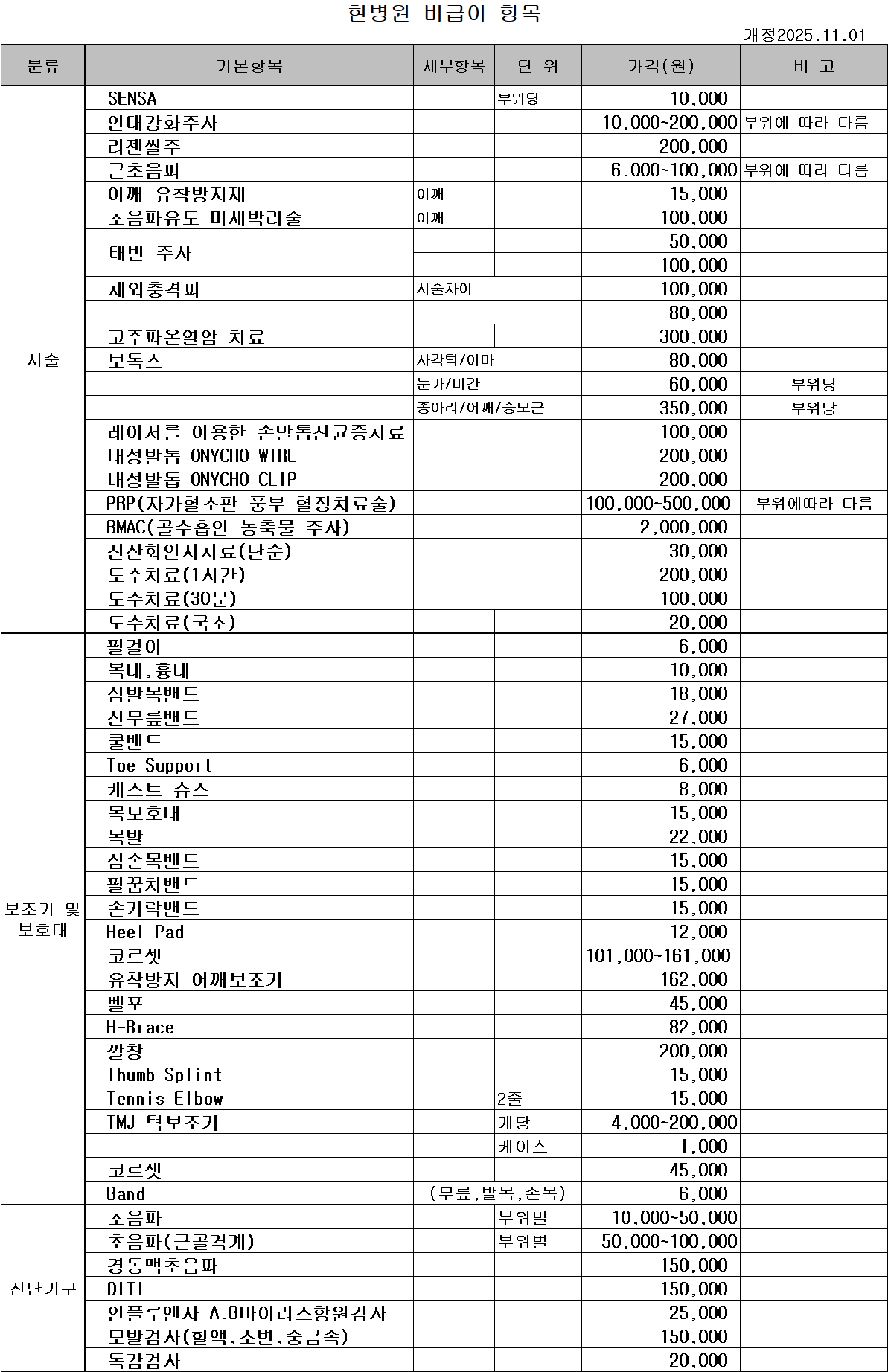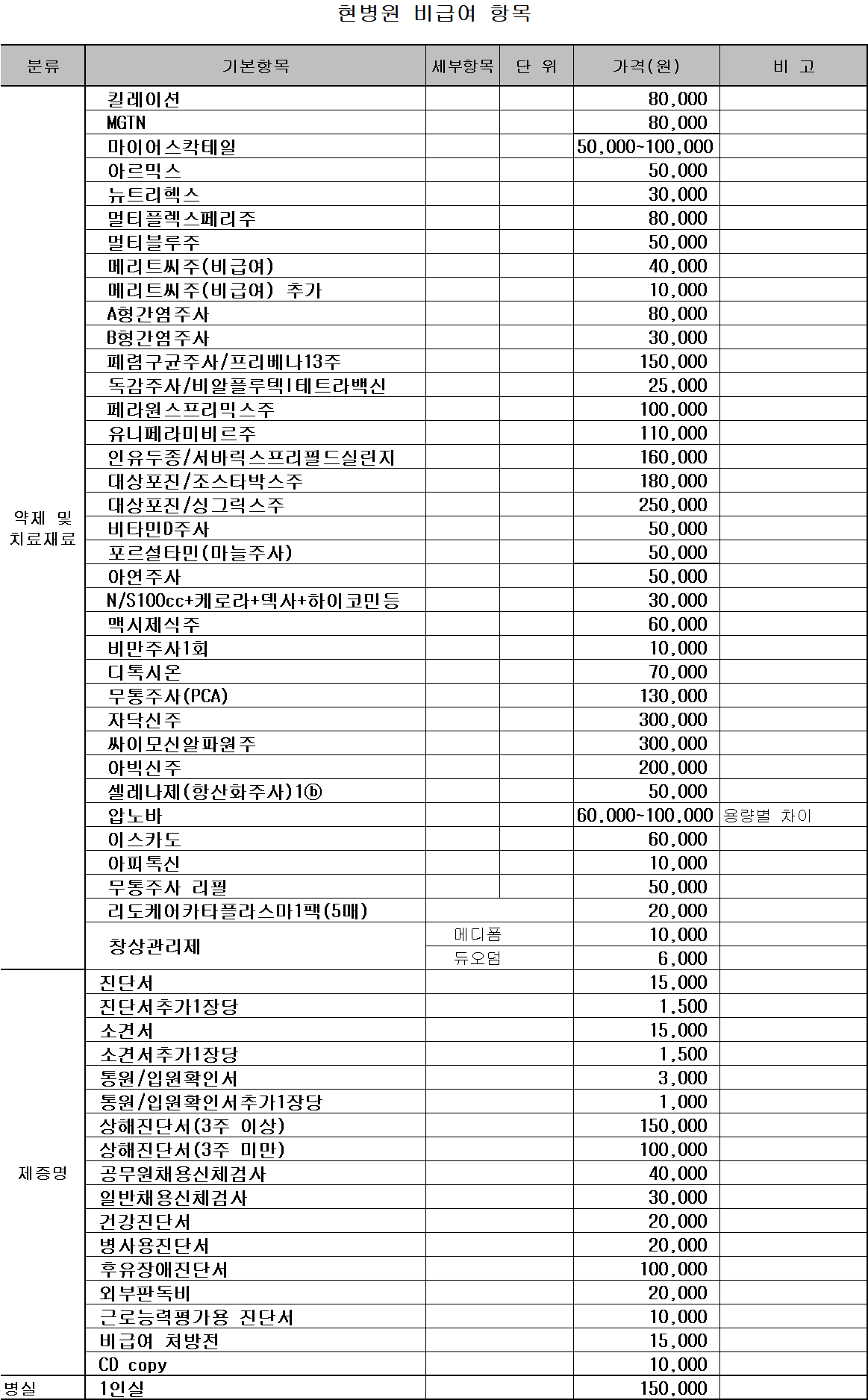 현병원 비급여 항목